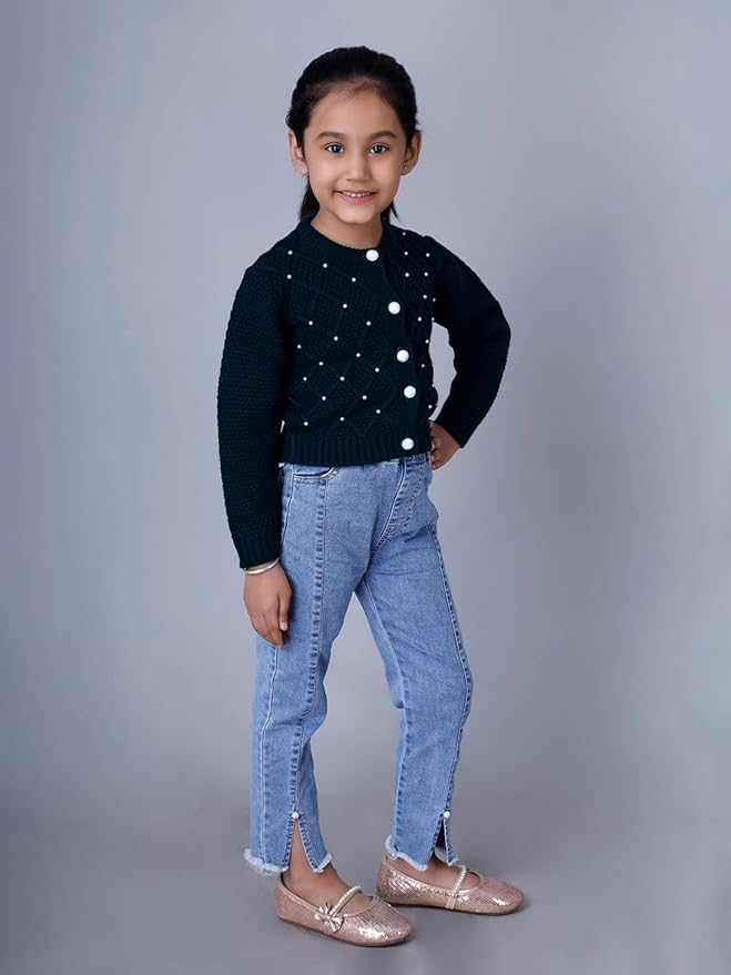 Description: This Hopscotch cardigan is designed for girls with a beautiful floral appliqué on a cable-knit base. Its soft fabric ensures warmth and comfort in cold weather. The stylish floral detailing makes it perfect for parties, school events, or outings. Its full-sleeve design keeps children cosy during winter days. Lightweight yet warm, it provides comfort without bulkiness. The cardigan pairs beautifully with dresses, skirts, or jeans. Its premium knit ensures durability and long-lasting use. A fashionable choice for young girls who love stylish winter wear. A perfect balance of charm, warmth, and practicality.