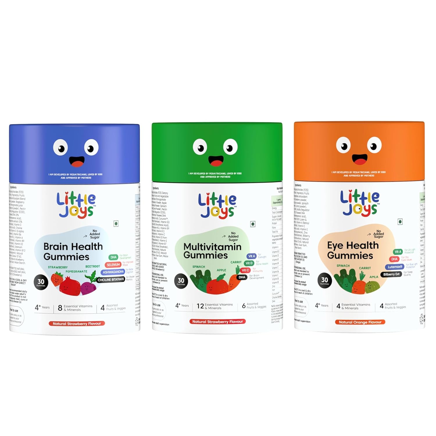 Description: Little Joys Health Supplement Combo is a specially designed pack of multivitamin, brain health, and eye health gummies for children. These gummies are packed with essential nutrients to support cognitive development, strengthen eyesight, and boost immunity in kids. The fun and delicious flavors make it a favorite among children.