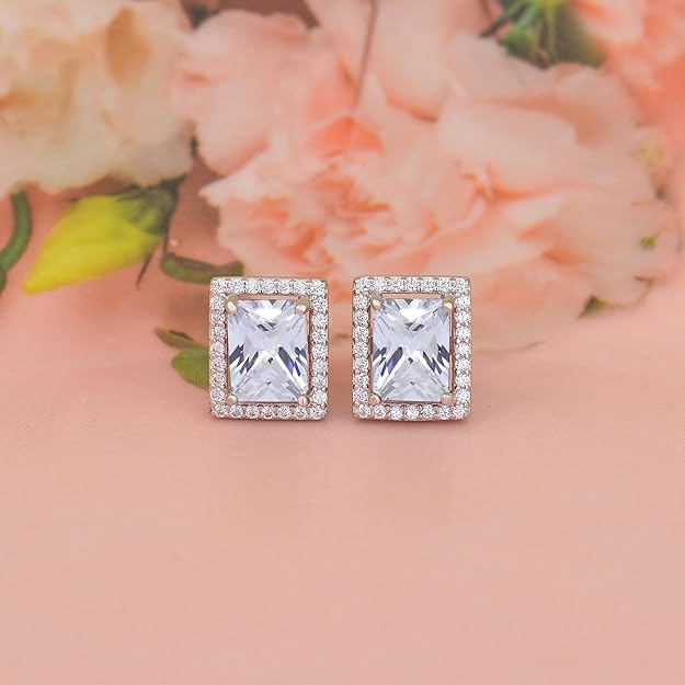 Description: These sophisticated stud earrings feature sparkling cubic zirconia stones set in rhodium-plated 92.5 sterling silver. The rhodium plating provides a bright, tarnish-resistant finish, giving them the luxurious look of white gold or platinum. The classic design and brilliant sparkle make them a versatile accessory that can be worn for any occasion. They are lightweight and comfortable for everyday wear, making them a perfect addition to your collection.