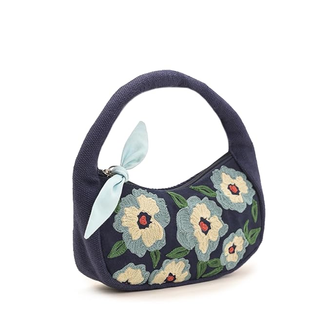 Description: The Boho Girl Indigo Blossom chic tote bag is a navy blue floral handbag with embroidered flowers for a feminine look. Its padded handles add comfort for long use. Ribbon detail enhances its charm and makes it more stylish. Spacious enough to carry essentials for travel, brunch, or casual outings. Lightweight yet durable for daily use. The floral embroidery adds a touch of elegance and uniqueness. Perfect for women who love bohemian chic style. A chic tote bag that combines comfort, style, and practicality beautifully.