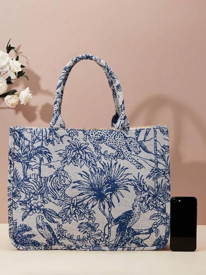 Description: The AURIELLE jungle-inspired jacquard chic tote bag brings a premium touch to your everyday style. Its unique blue and beige pattern adds a modern yet natural feel. Spacious design makes it perfect for carrying essentials like books, laptops, or shopping items. Made from durable fabric, it is strong enough for daily use. Soft handles provide comfort even when carrying heavier loads. Lightweight and versatile, making it ideal for college, work, or casual outings. The elegant design works with both Western and ethnic wear. A chic tote bag that combines practicality with eye-catching style.