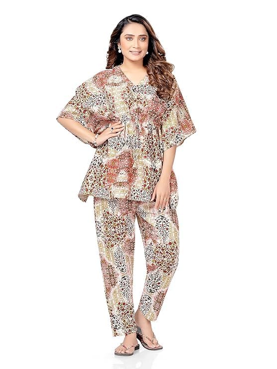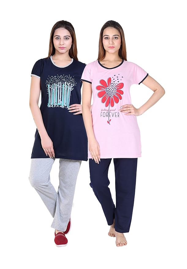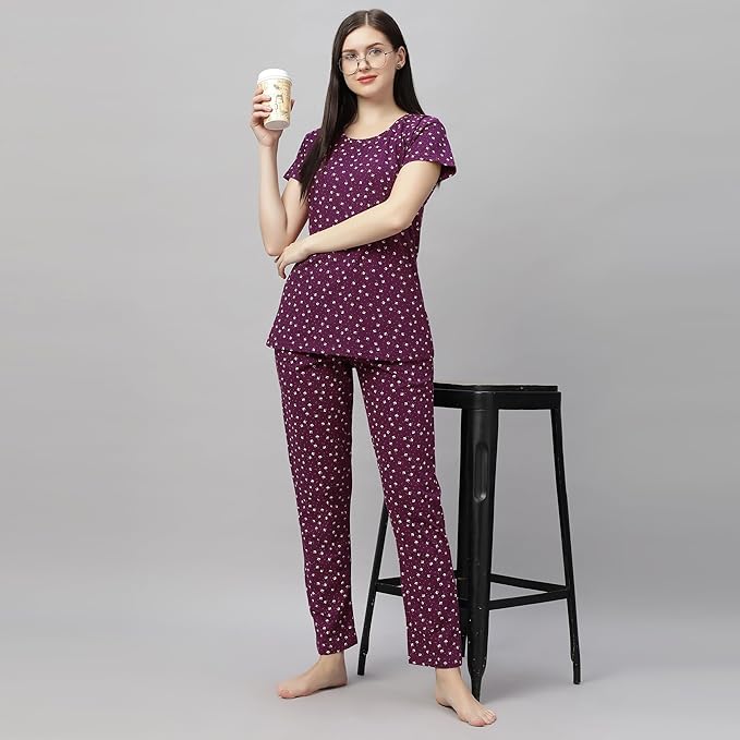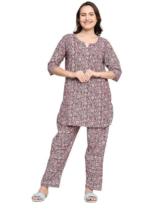 Description: A soft and comfortable cotton night suit perfect for a restful sleep. Features a half-sleeve top and elastic waist pajama pants for a relaxed fit and ease of movement. The printed design adds a stylish touch to your loungewear collection. Breathable fabric keeps you cool and cosy all night long. Ideal for daily use, home lounging, or casual sleepwear. Easy to wash and maintain without losing shape or colour. Lightweight yet durable, making it a long-lasting addition to your wardrobe. Perfect for women who want both comfort and style in their sleepwear.