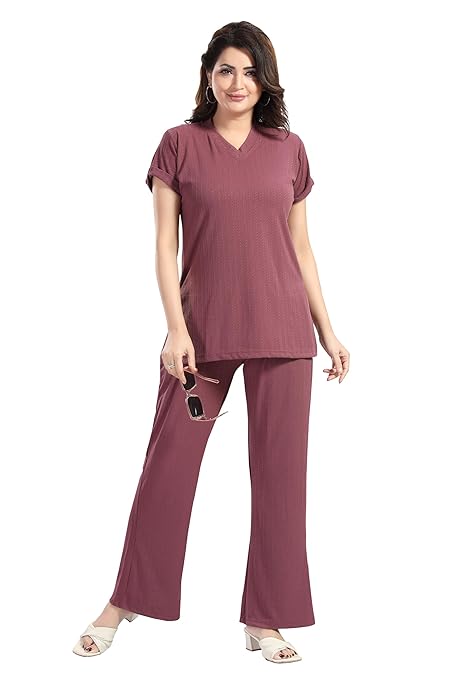 Description: Owlsky Lounge Co-ord Set is designed for women who want stylish comfort. This set includes a V-neck short-sleeve top with flared pants. Made from soft cotton, it feels breathable and cosy. The relaxed fit makes it suitable for lounging, casual outings, or travel. Its simple yet fashionable design adds elegance to everyday wear. Easy to style with flats or sneakers for a chic look. The cotton fabric ensures comfort even in warmer seasons. Durable stitching makes it long-lasting and easy to maintain. Perfect choice for women who enjoy versatile lounge outfits.